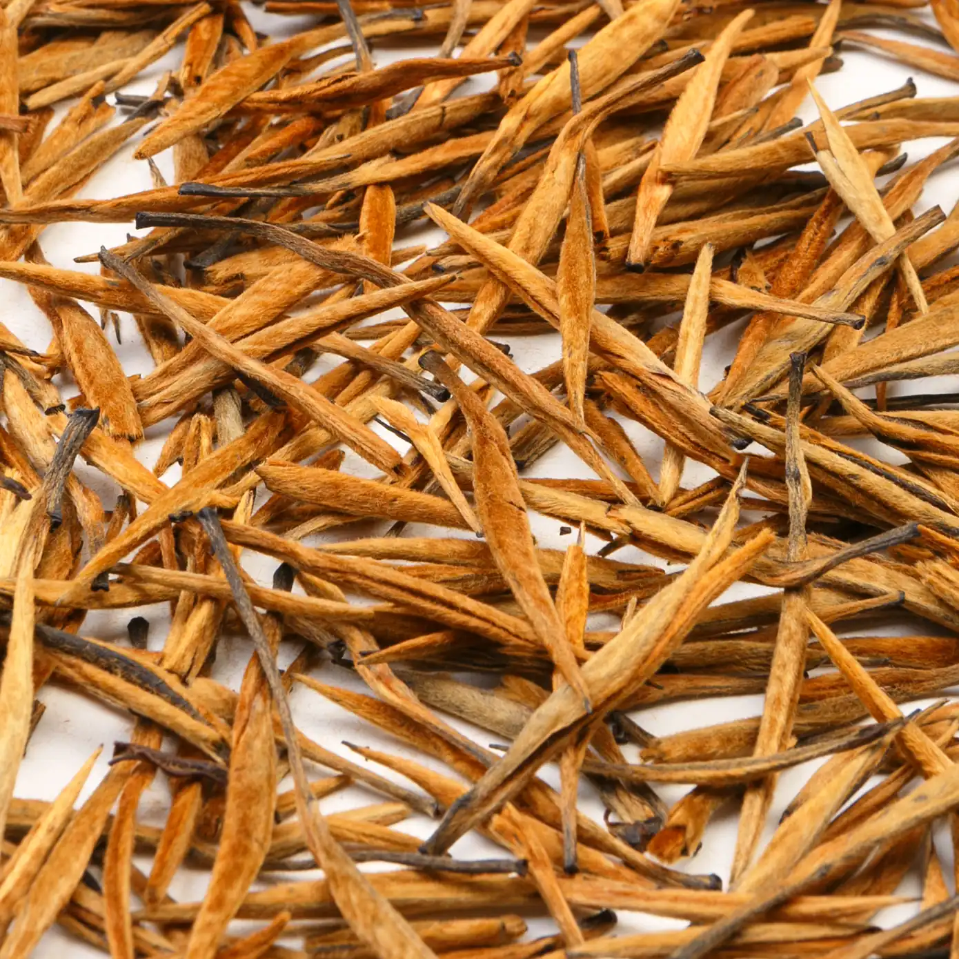 Золотые Иглы (Да Цзинь Чжэнь / Jin Zhen) — элитный красный дяньхун из Юньнани, сделанный исключительно из огромных золотистых почек. Ни одного листа — только типсы, покрытые густым апельсиново-рыжим пушком. Это буквально «золотые скипетры» среди чаёв.